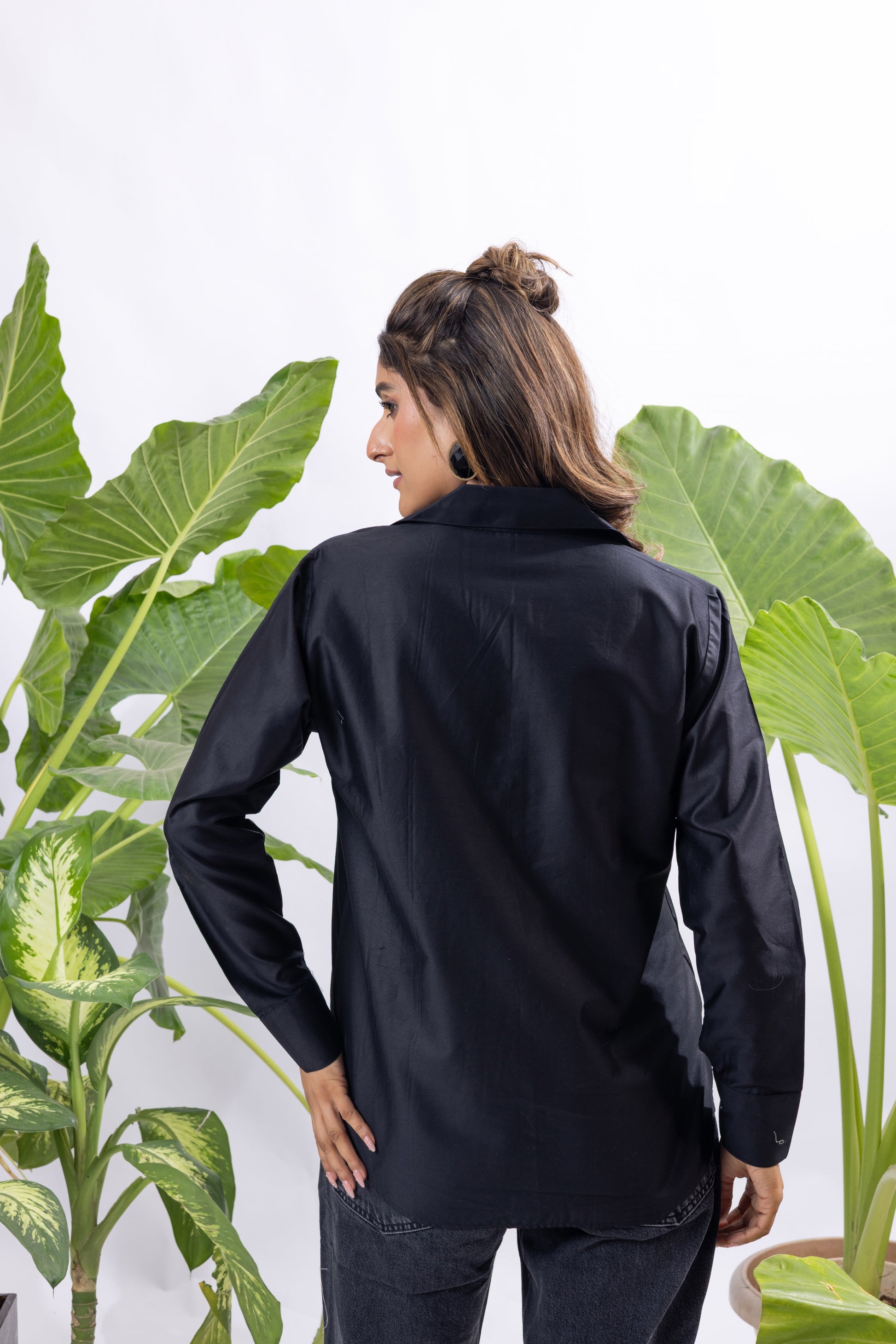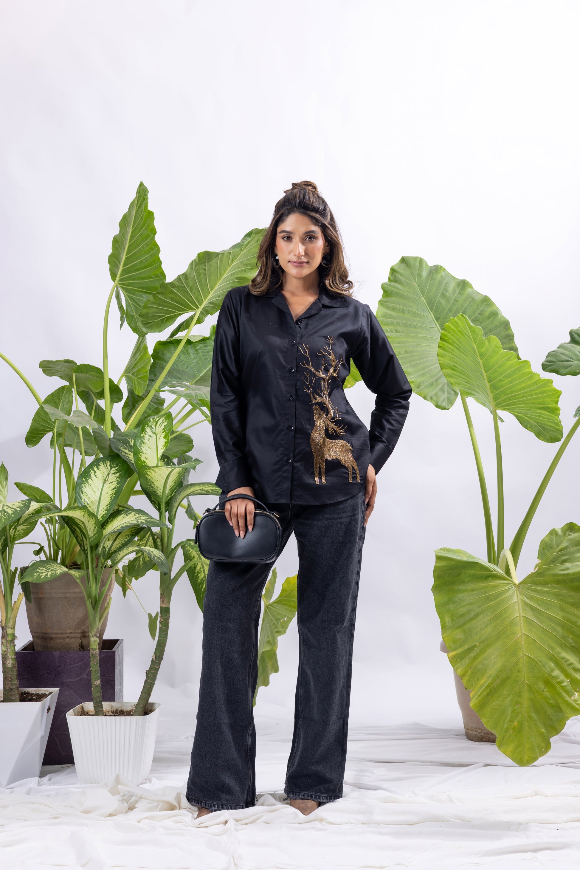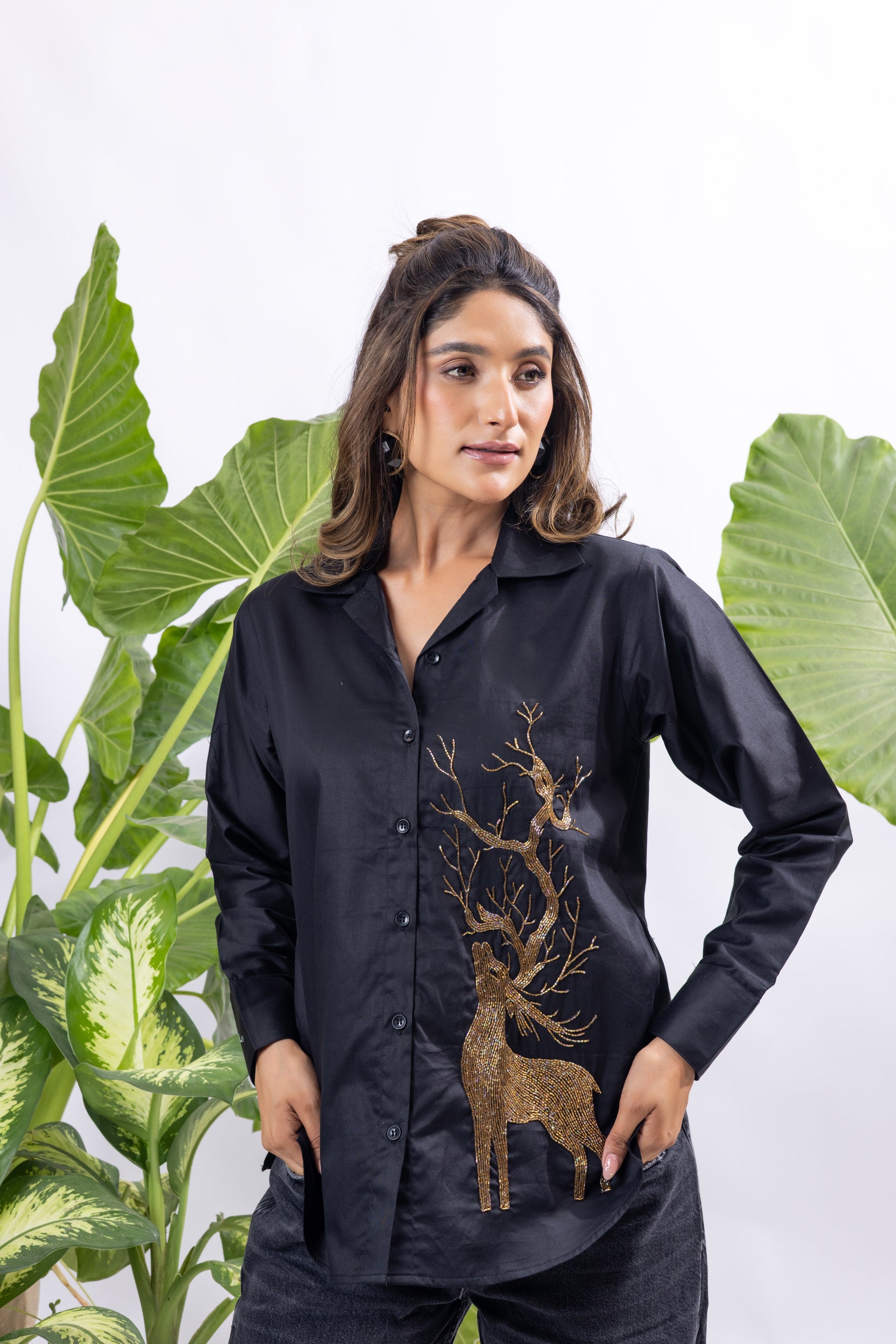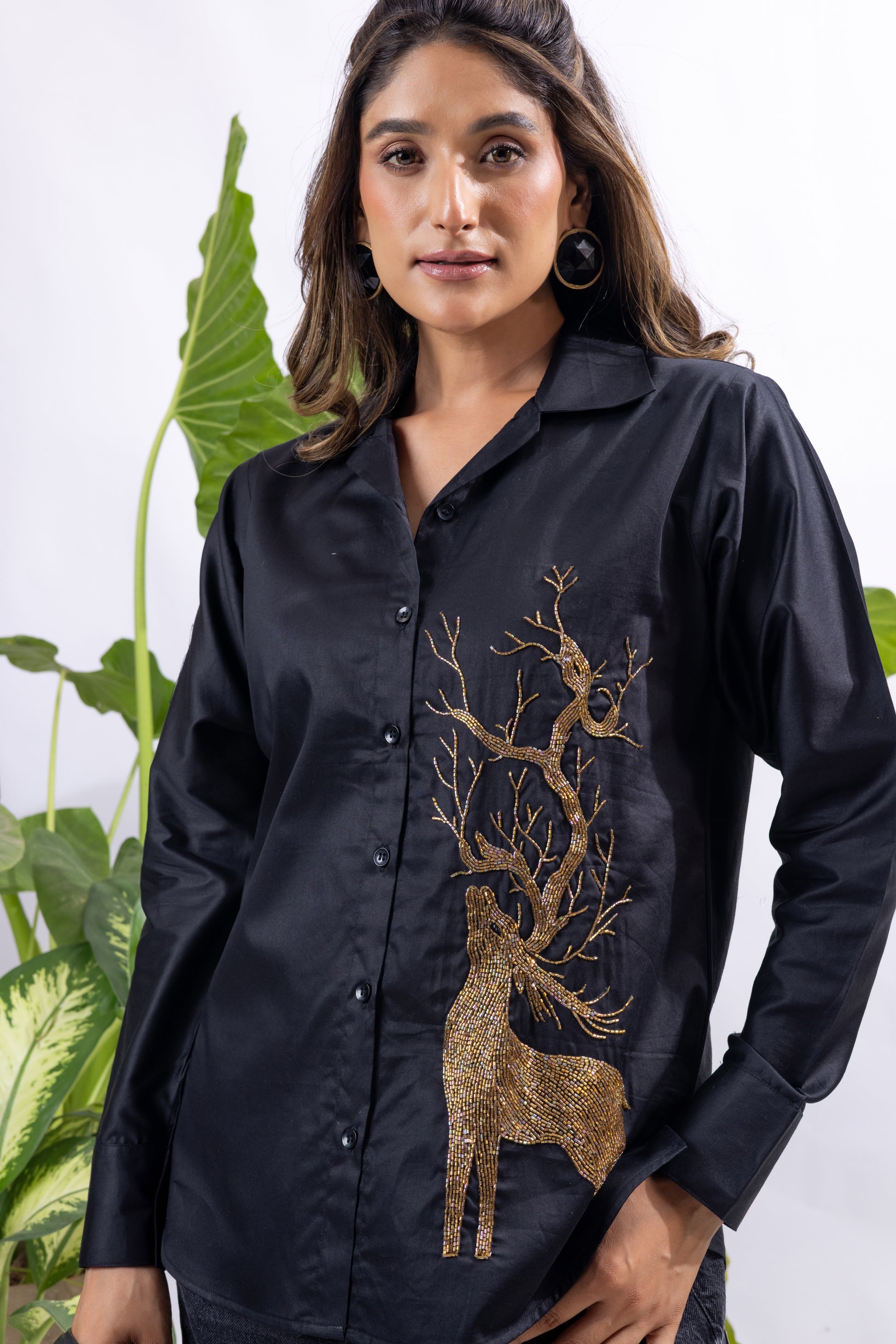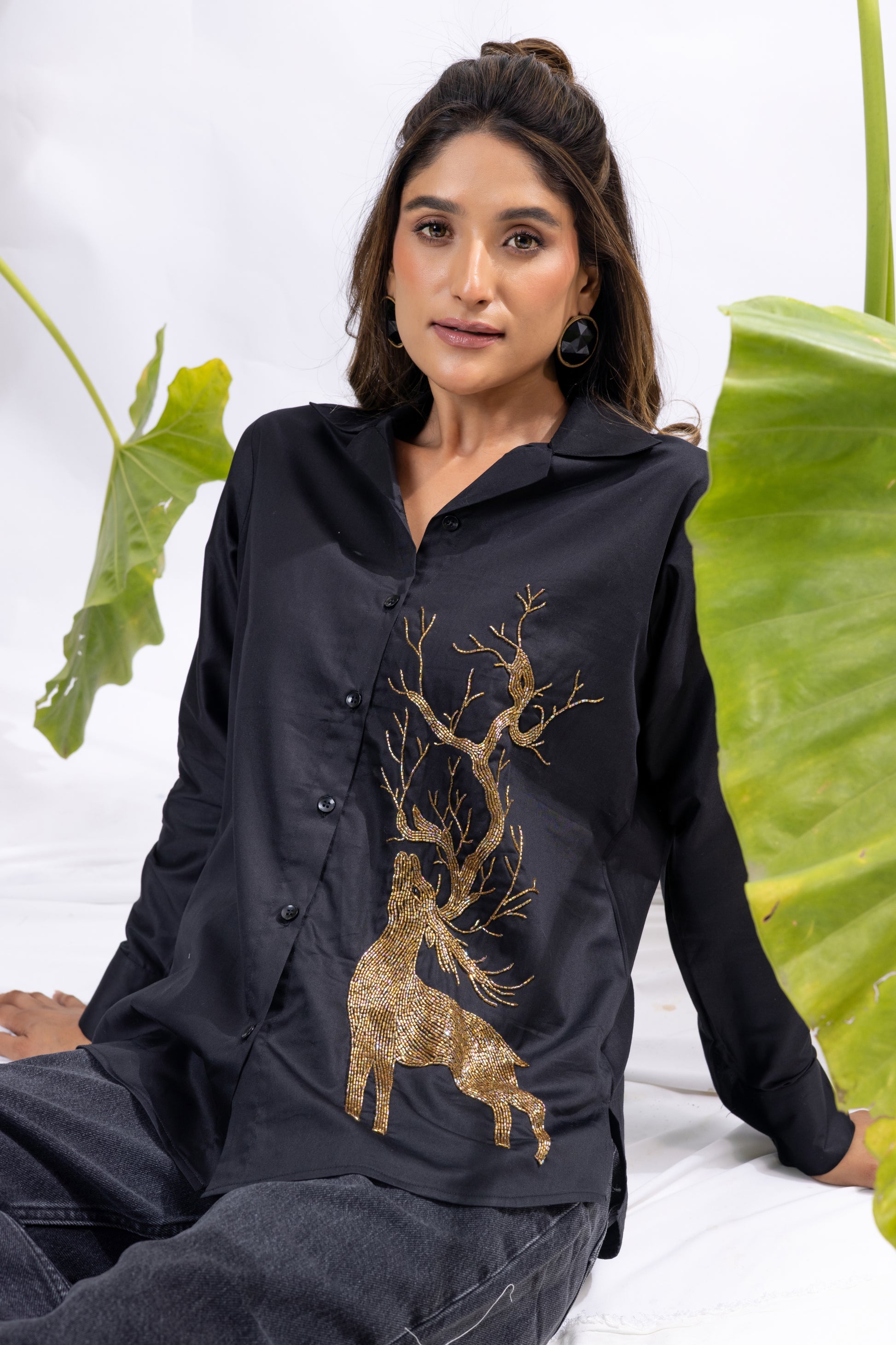 Perfect vaccation wear. We love this Black shirt with classy golden reindeer work on it , the edgy embroidery is sure to add subtle funk to your wardrobe. This piece comes as a standalone shirt.