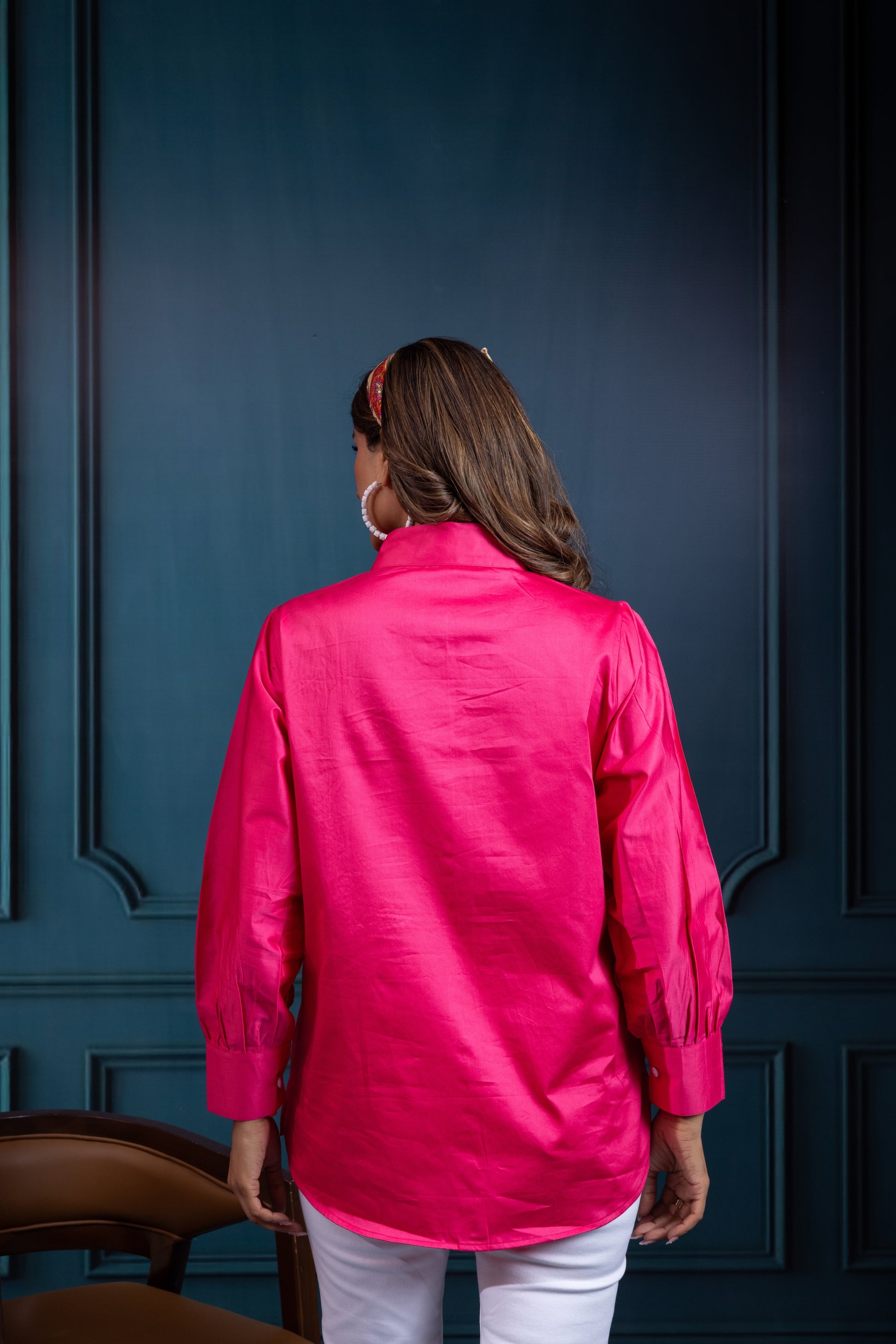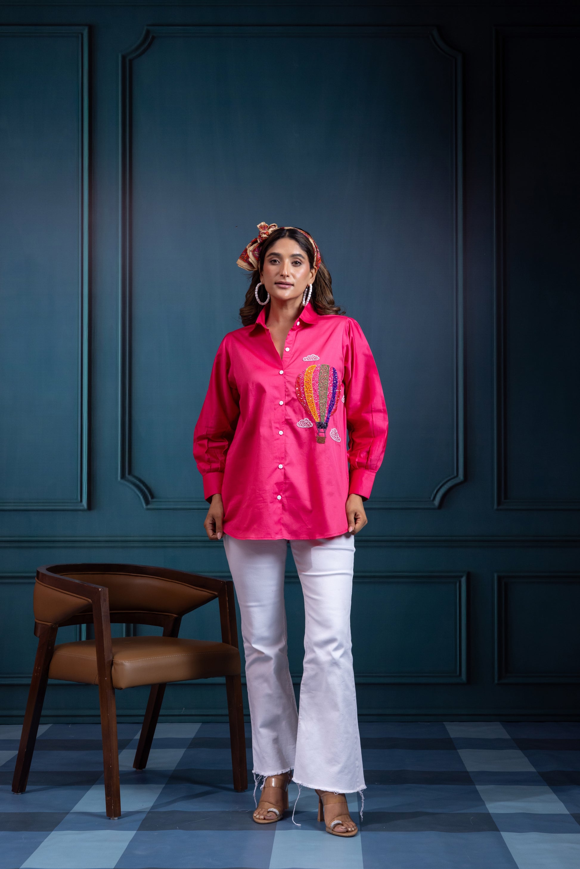 Perfect vaccation wear. We love this fuscia pink colour and the edgy embroidery is sure to add subtle funk to your wardrobe. This piece comes as a standalone shirt.