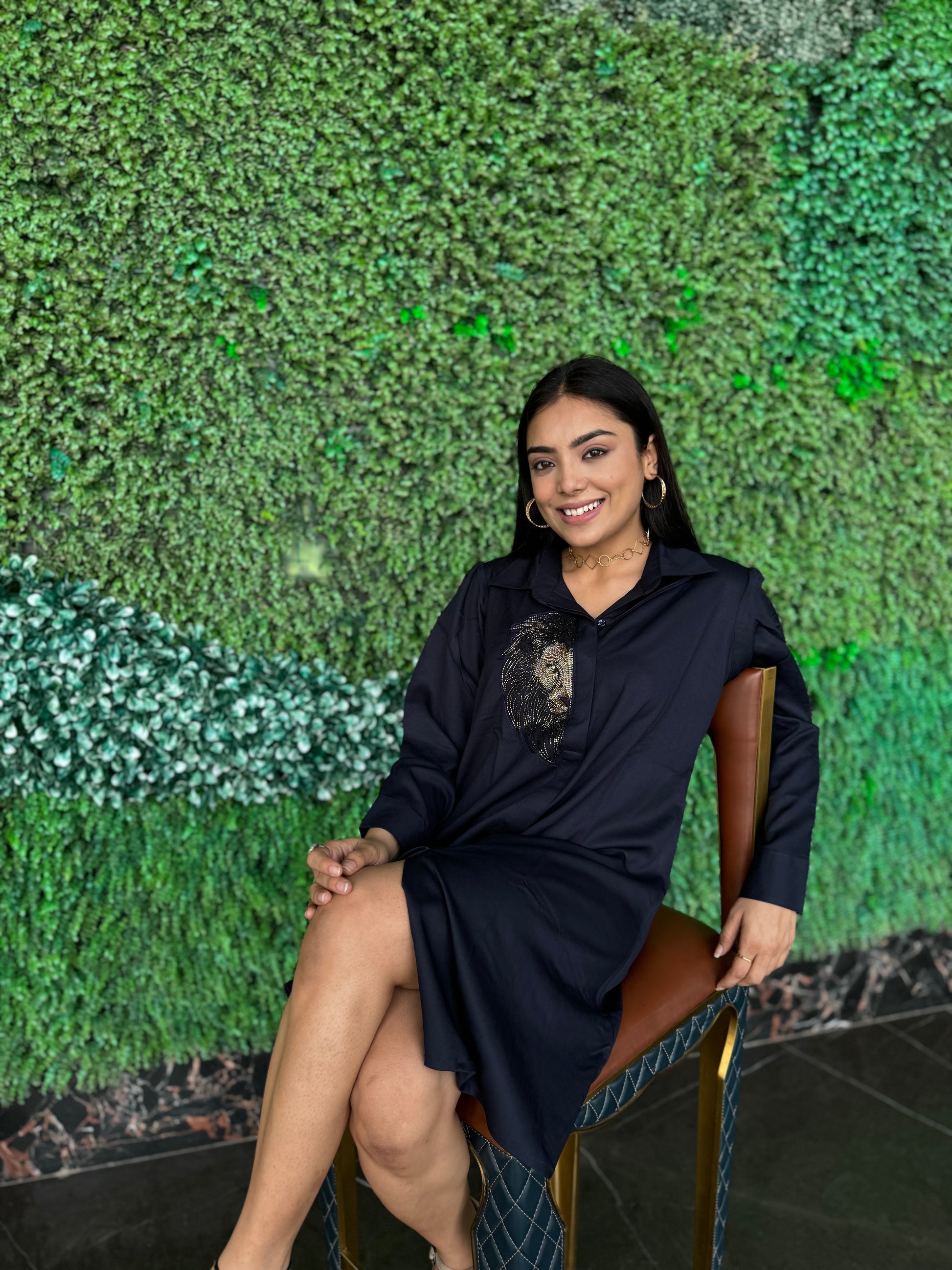 Colour: Blue knee length dress embroidered with the face of a lion